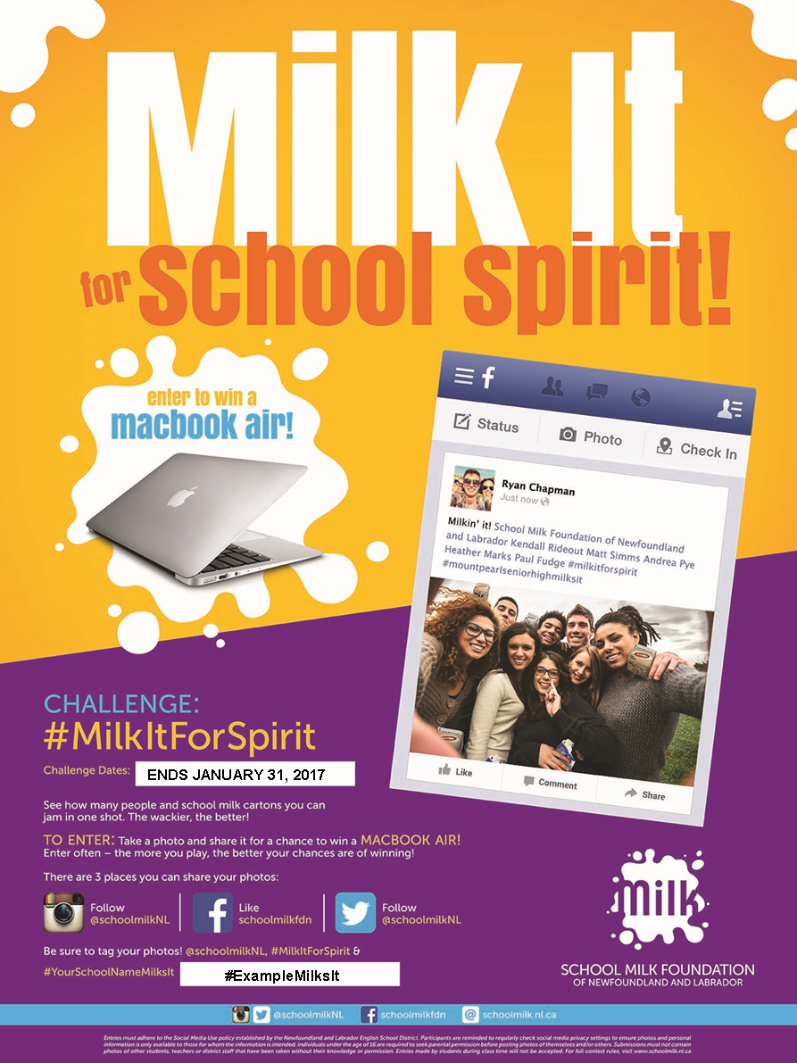 Milk It For Spirit is a social media challenge that encourages spirit building among students in grades 7 to 12. The challenge requires students to squeeze as many bodies and school milk cartons possible into one photo. Students post the picture and tag @SchoolMilkNL on any of our three social media platforms (Twitter, Facebook, or Instagram). It’s important that the students hashtag #MilkItForSpirit along with their school name. An example is provided on the poster. If students are uncomfortable sharing the photo online, they may email the picture directly.