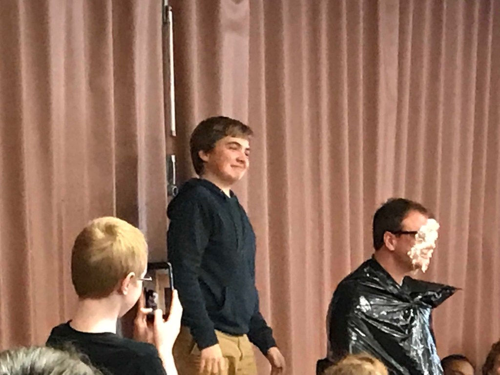 We have reached a milestone on our Children’s Wish Fundraising Campaign! As we have raised over $4500 toward our goal of $10 000, Mr. West has put his face on the line. He graciously agreed to be pied in the face by Student Council President Daniel Blackmore in front of the MDJH student body. The weapon of choice was Lemon Meringue. Keep an eye out for more milestones, as your donations help bring us closer to our goal of making a child’s wish come true.