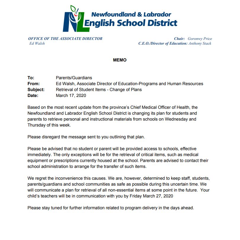 The Newfoundland and Labrador English School District continues to formulate plans to support our province’s students and teachers following the unprecedented suspension of in-class instruction within the public K-12 school system. As new protocols have been put in place, many District employees throughout the province are working from home, as all residents of our province manage child care, health care and, in some instances, care-giver responsibilities. These are challenging times for us all. I want to assure you the public education system will remain connected to our students and will be available to support our school communities through whatever means are available and safe.