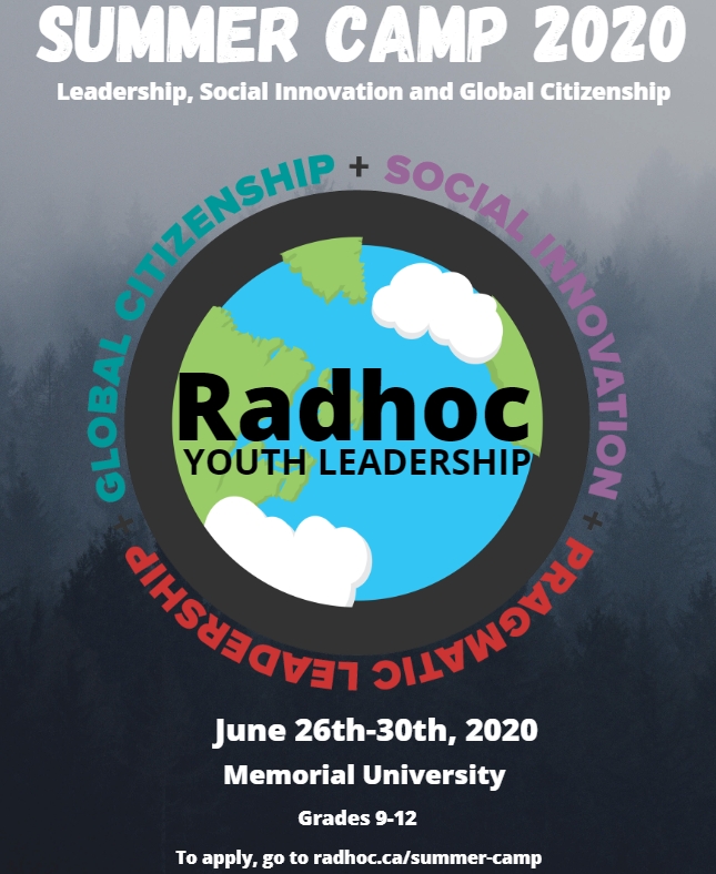 Radhoc Youth Leadership is hosting a camp on June 26th-30th at Memorial University. The camp is for students in grade nine to students leaving grade twelve. Radhoc is a for youth by youth organization that aims to educate high school students on local and global societal issues and leadership skills. We do this in the hope that they will be able to return to their schools and communities with the motivation and skills necessary to make a positive change in the world.