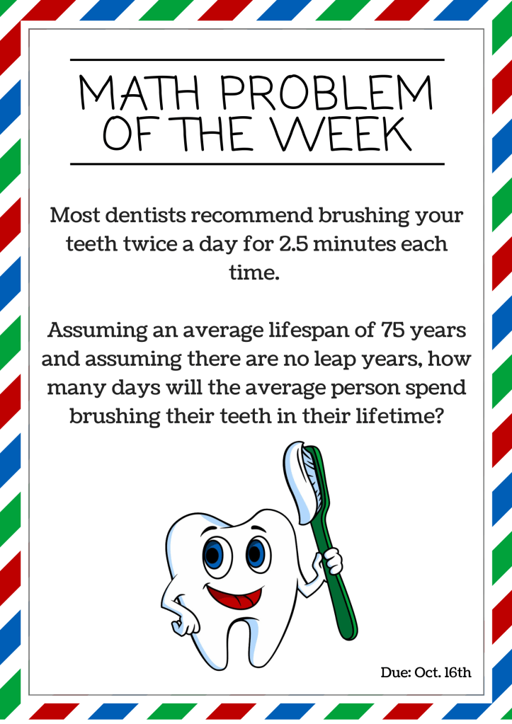 The Macdonald Drive Junior High Math Department is proud to present the first of this year’s Math Problem of the Week questions today. Your teachers will present them to you in homeroom, or by request, and submissions should be done electronically (that is, emailed to Mr. Shane Lambert).