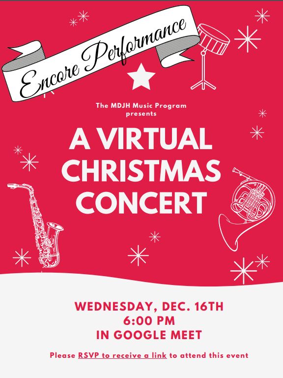 Our Virtual Christmas Concert was such a success that we are doing it again! It will be rebroadcast on Wednesday, December 16th at 6:00pm. If you would like to watch it again, or see it for the first time, click here to request an invite to the Google Meet.