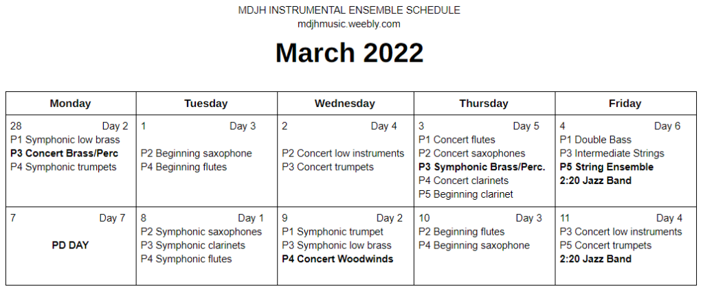 Band Schedule – March mdjh Uncategorized March 1, 2022 1 Minute Share this: Click to print (Opens in new window) Print Click to email a link to a friend (Opens in new window) Email Published by mdjh View all posts by mdjh Published March 1, 2022