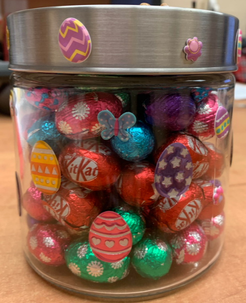 Guess how many eggs are in the jar, and you could win the eggs! Guesses must be handed in to your homeroom teacher or to the office. In the event of more than one student guessing the correct number, a winner will be selected from a random draw of the correct guesses.