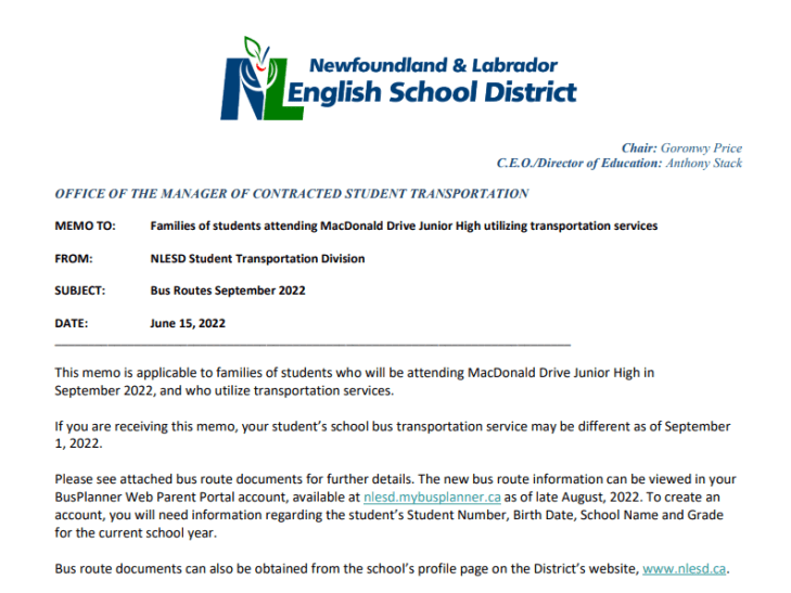 Bus route documents can also be obtained from the school’s profile page on the District’s website, http://www.nlesd.ca.