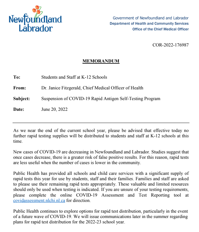 Public Health has provided all schools and child care services with a significant supply of rapid tests this year for use by students, staff and their families. Families and staff are asked to please use their remaining rapid tests appropriately. These valuable and limited resources should only be used when testing is indicated. If you are unsure of your testing requirements, please complete the online COVID-19 Assessment and Test Reporting tool at covidassessment.nlchi.nl.ca for direction.