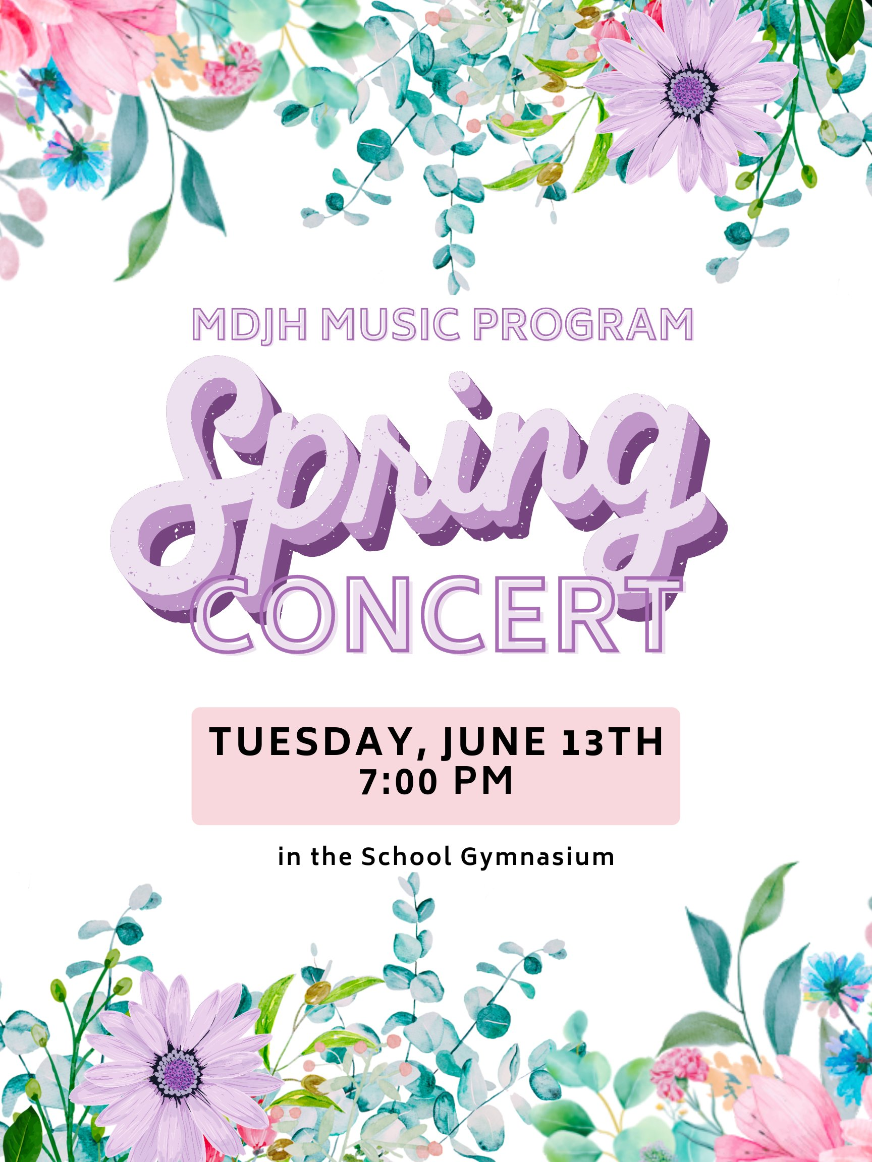 The MDJH Spring Concert will take place on Tuesday, June 13th at 7:00pm in the school gymnasium. We hope to see you there!