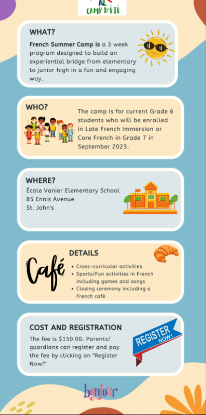 Is there a Grade 6 student in your household? The NLESD is hosting a French Language Summer Camp from June 26- July 14 for Grade 6 students enrolled in Late French Immersion/Core French in Grade 7 in September.