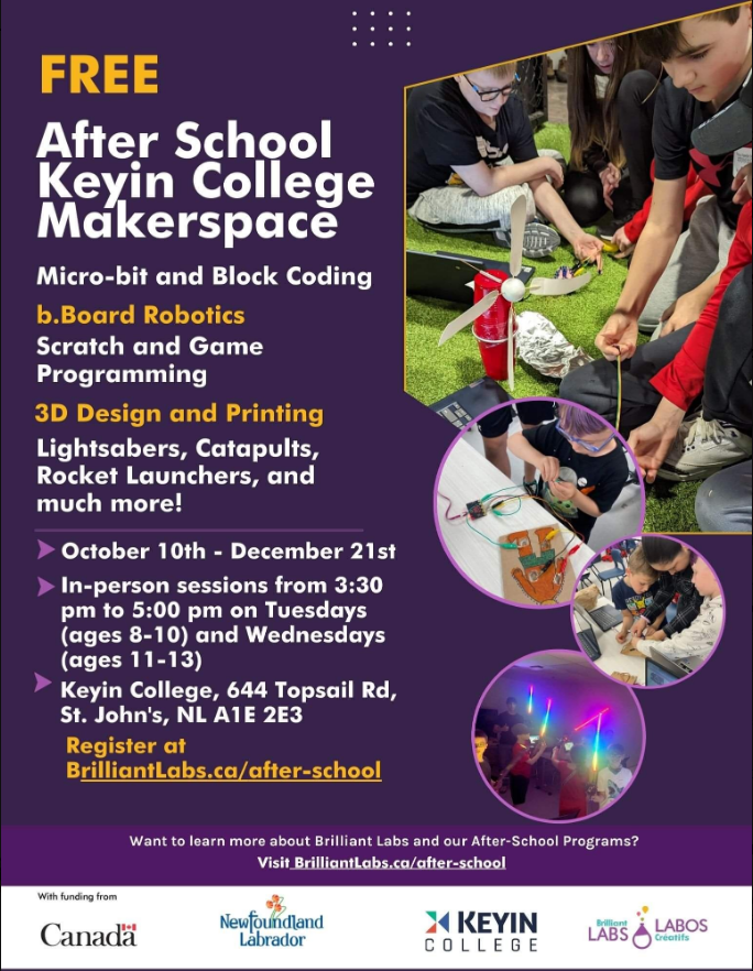Free After School Makerspace at Keyin College mdjh Uncategorized October 19, 2023 1 Minute To register or for more information, visit https://www.brilliantlabs.ca/after-school Share this: Click to print (Opens in new window) Print Click to email a link to a friend (Opens in new window) Email Published by mdjh View all posts by mdjh Published October 19, 2023