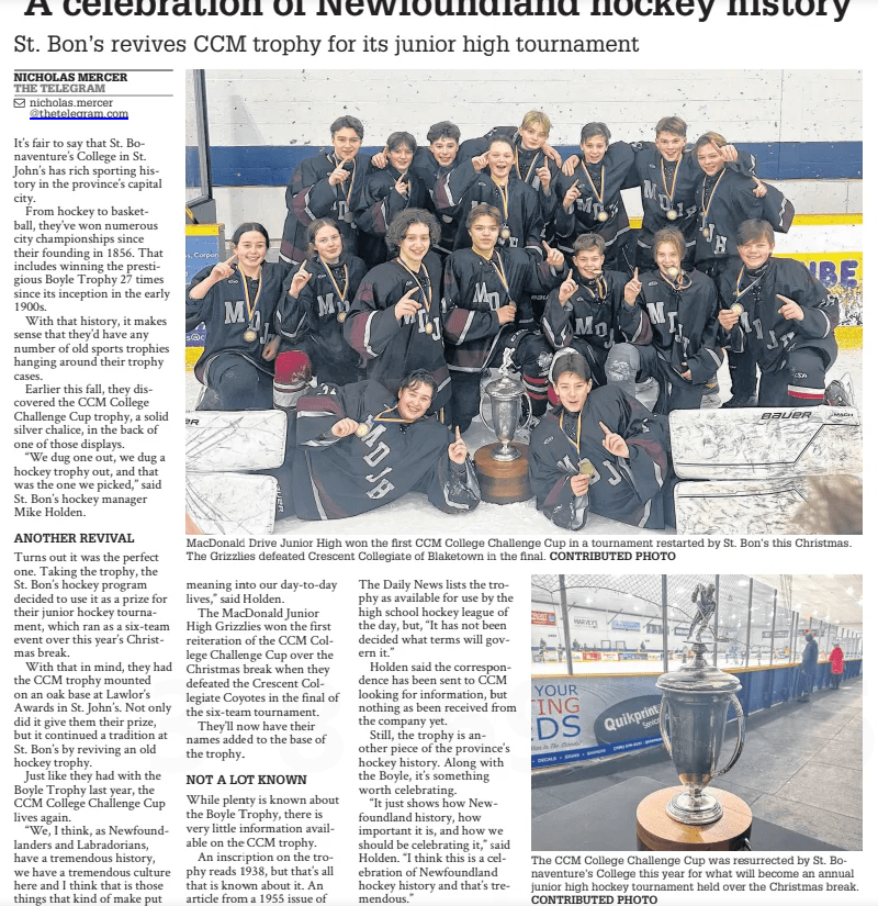 MDJH Hockey In The News The MDJH Hockey Team was featured in today’s paper, following their win of the revived CCM College Challenge Cup over the recent Christmas Holidays. Congrats again to the team players and coaches! Share this: Click to print (Opens in new window) Print Click to email a link to a friend (Opens in new window) Email