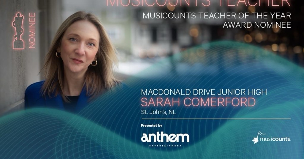 Congratulations to Ms. Comerford, who has been nominated for the 2024 MusiCounts Teacher of the Year Award, presented by Anthem Entertainment Group!
