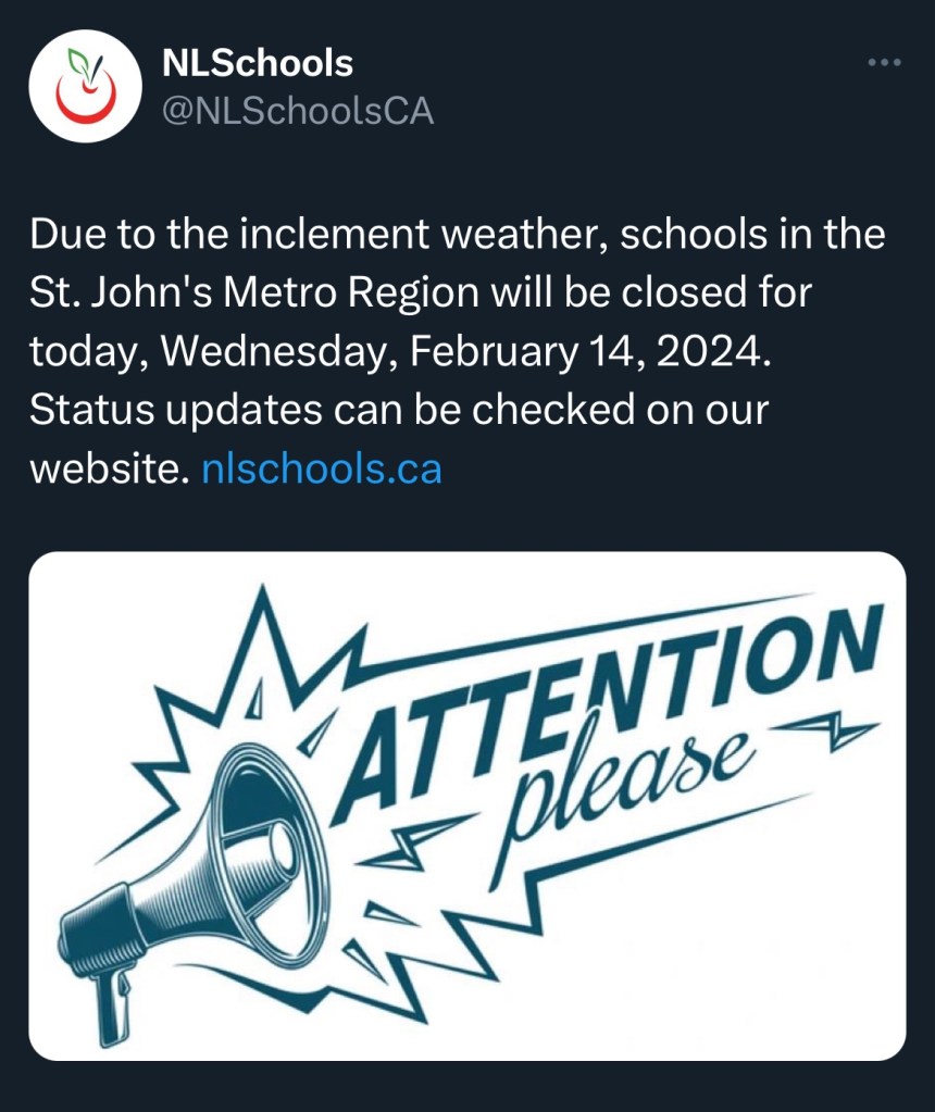 Snow Day – Wednesday, February 14 mdjh Uncategorized February 14, 2024 1 Minute As suspected, today will be a snow day. Stay warm! Share this: Click to print (Opens in new window) Print Click to email a link to a friend (Opens in new window) Email Published by mdjh View all posts by mdjh Published February 14, 2024