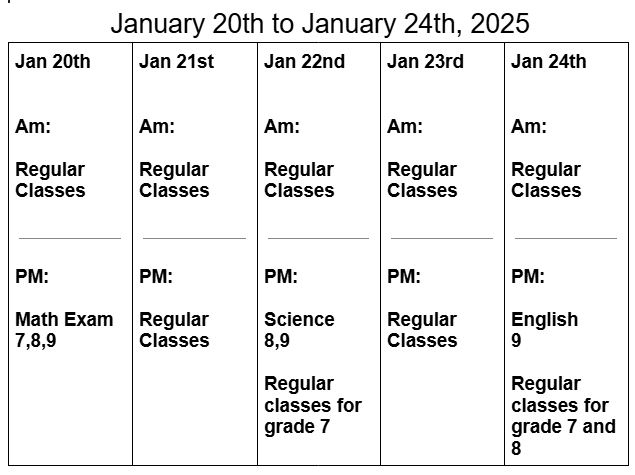 Exams will take place 4th period starting at 12:15 promptly. Students are expected to bring something to read in the event they finish their exam early. They will not have permission to leave the exam classroom until dismissed for the bus at 2:10 pm. Buses will be running their regular schedules.