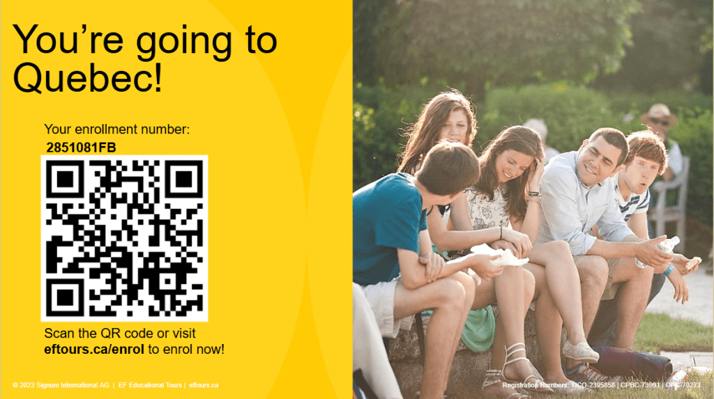 Any students that will be in the Grade 8 or 9 French Immersion program next year are eligible to attend the EF tour trip in May 2026 to Quebec. A parent meeting will be held June 11 at 7pm in the school library.