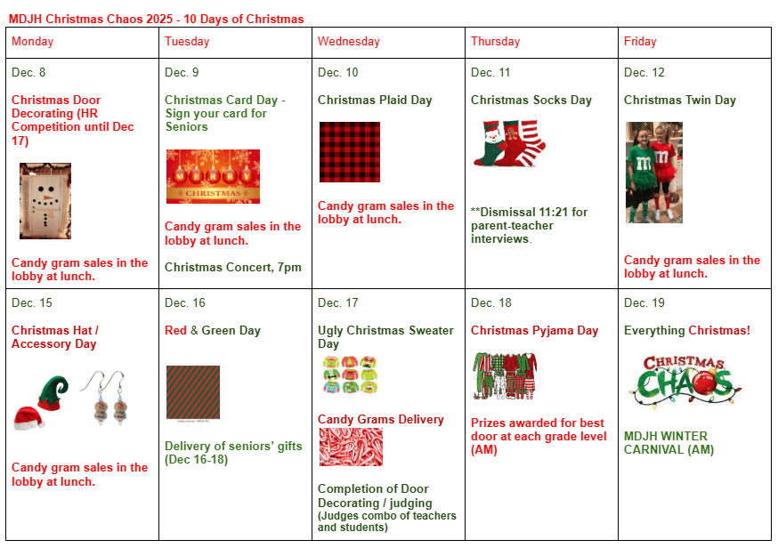 Monday, December 8, is the start of our 2-week Christmas Chaos events! The Student Council is happy to announce some fun activities for students and staff. See schedule below and in Google Classrooms!